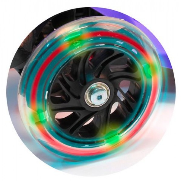 Самокат со съемным сиденьем с прозрачными колесами под цвет самоката и регулируемым по высоте рулем. Поставляется в трех цветах - салатовый, розовый, голубой.Характеристики